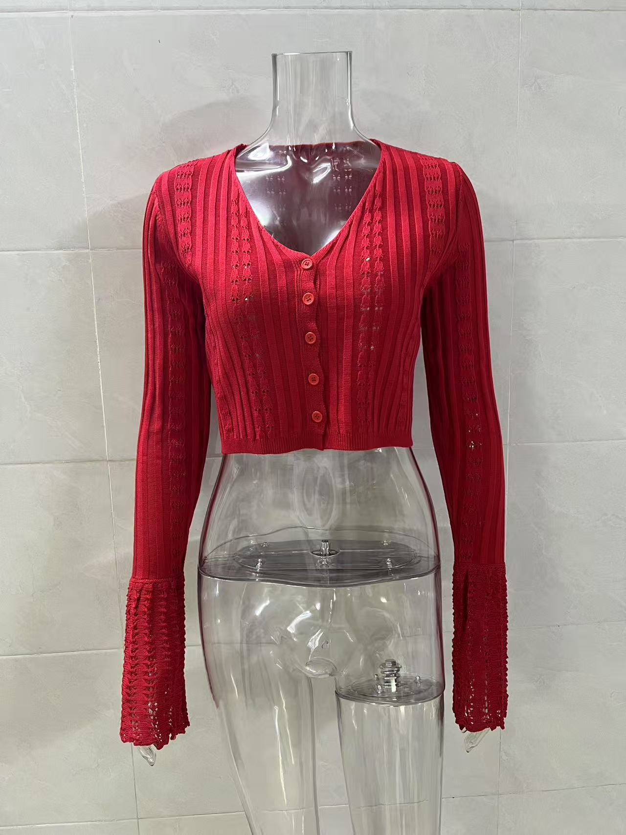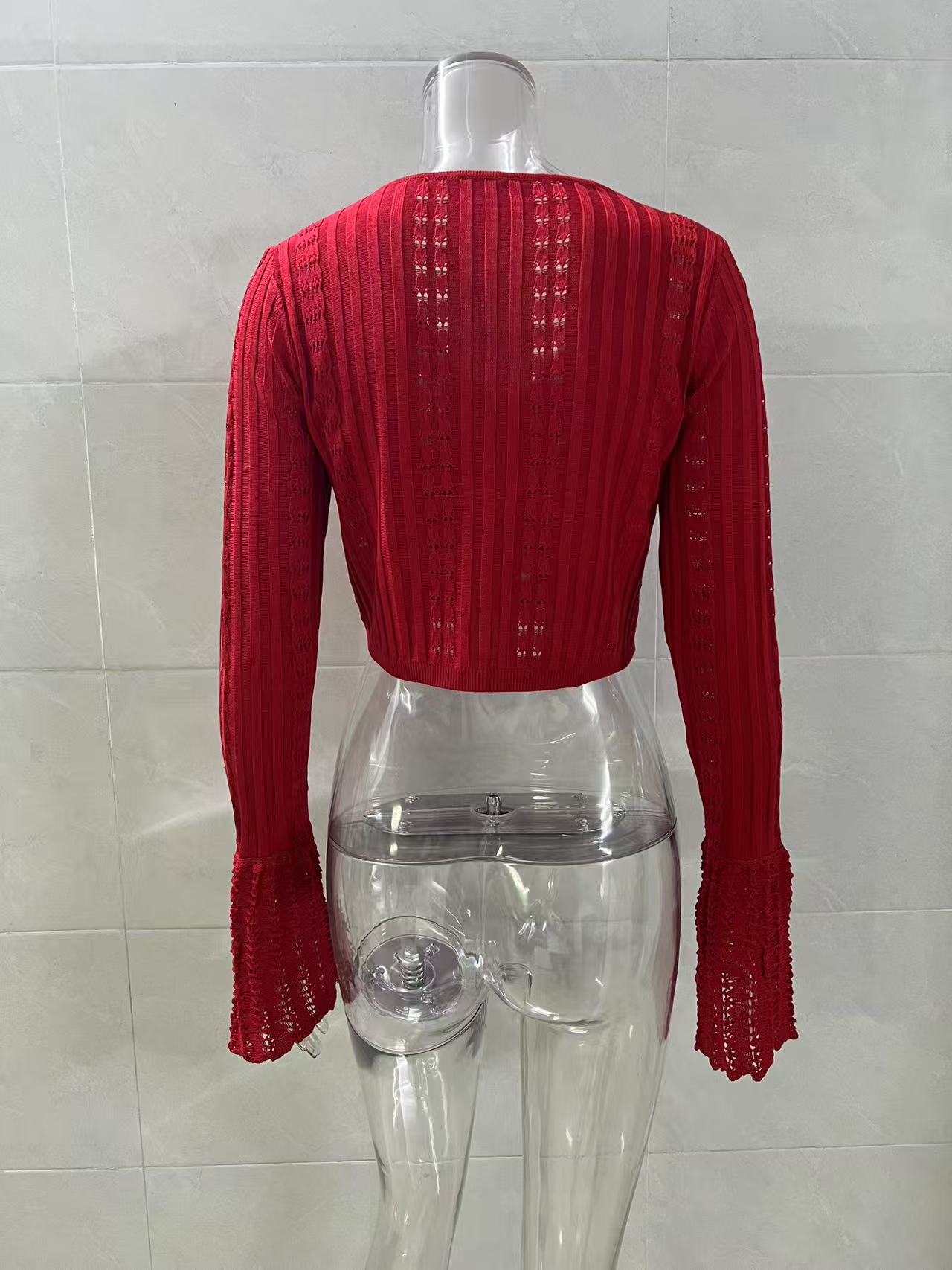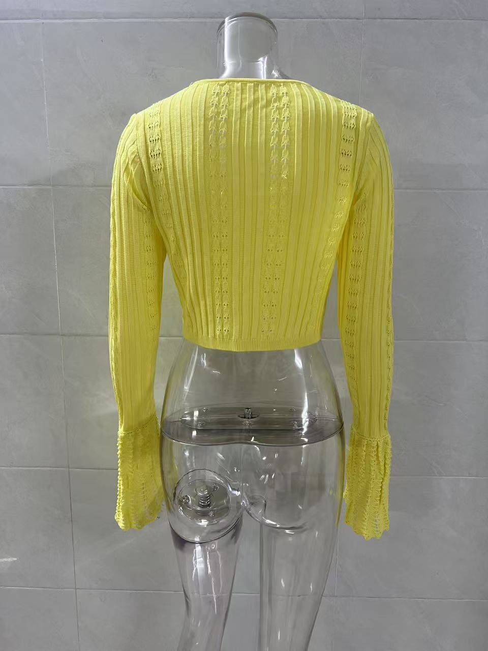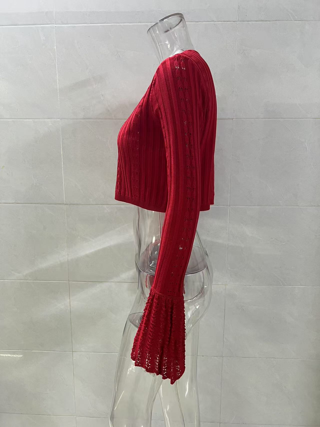Women's Clothes Sexy Cutout Bell Sleeve Solid Color Short Knitted Top
