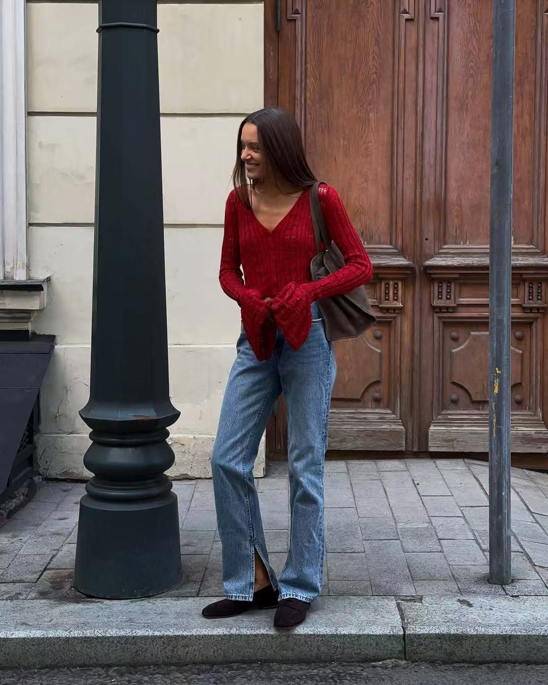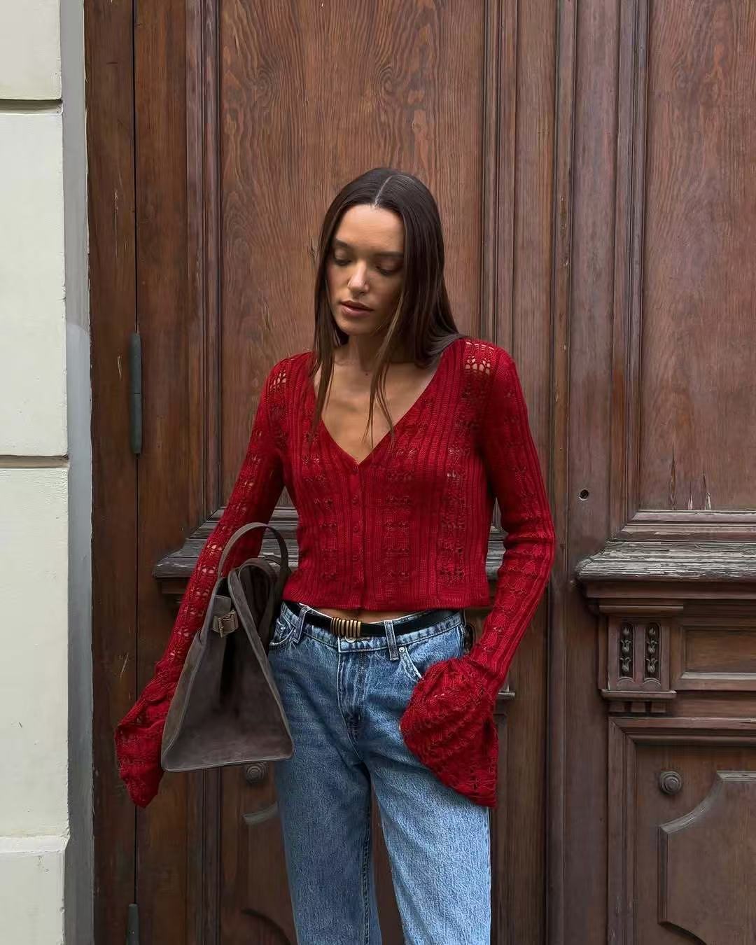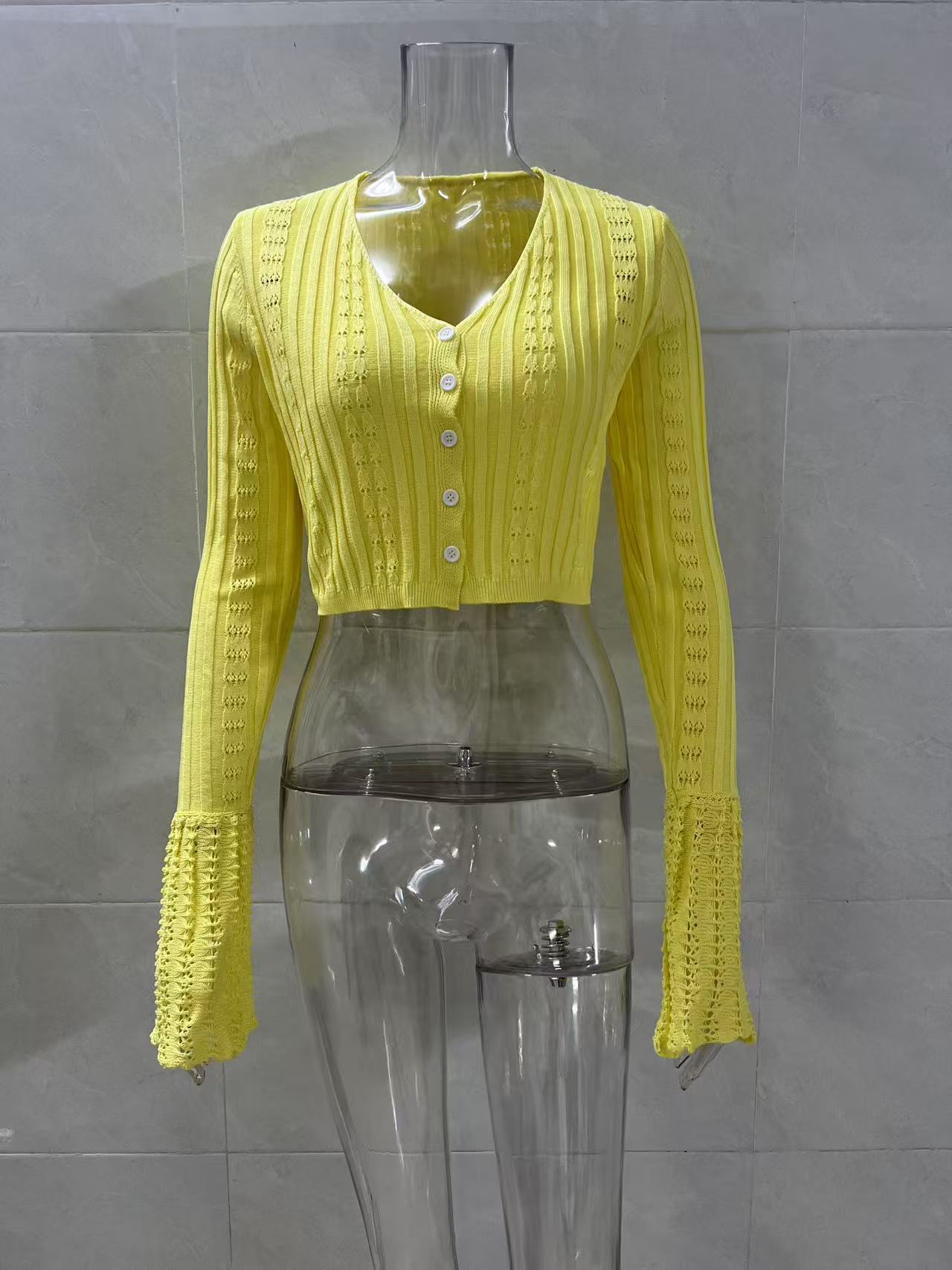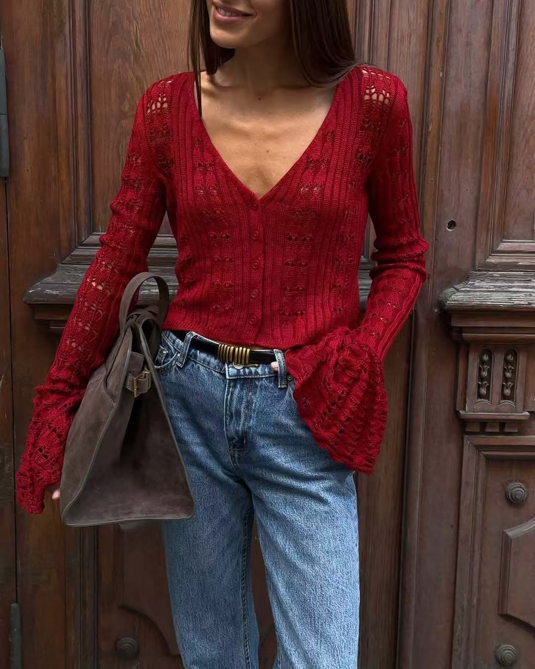 Women's Clothes Sexy Cutout Bell Sleeve Solid Color Short Knitted Top